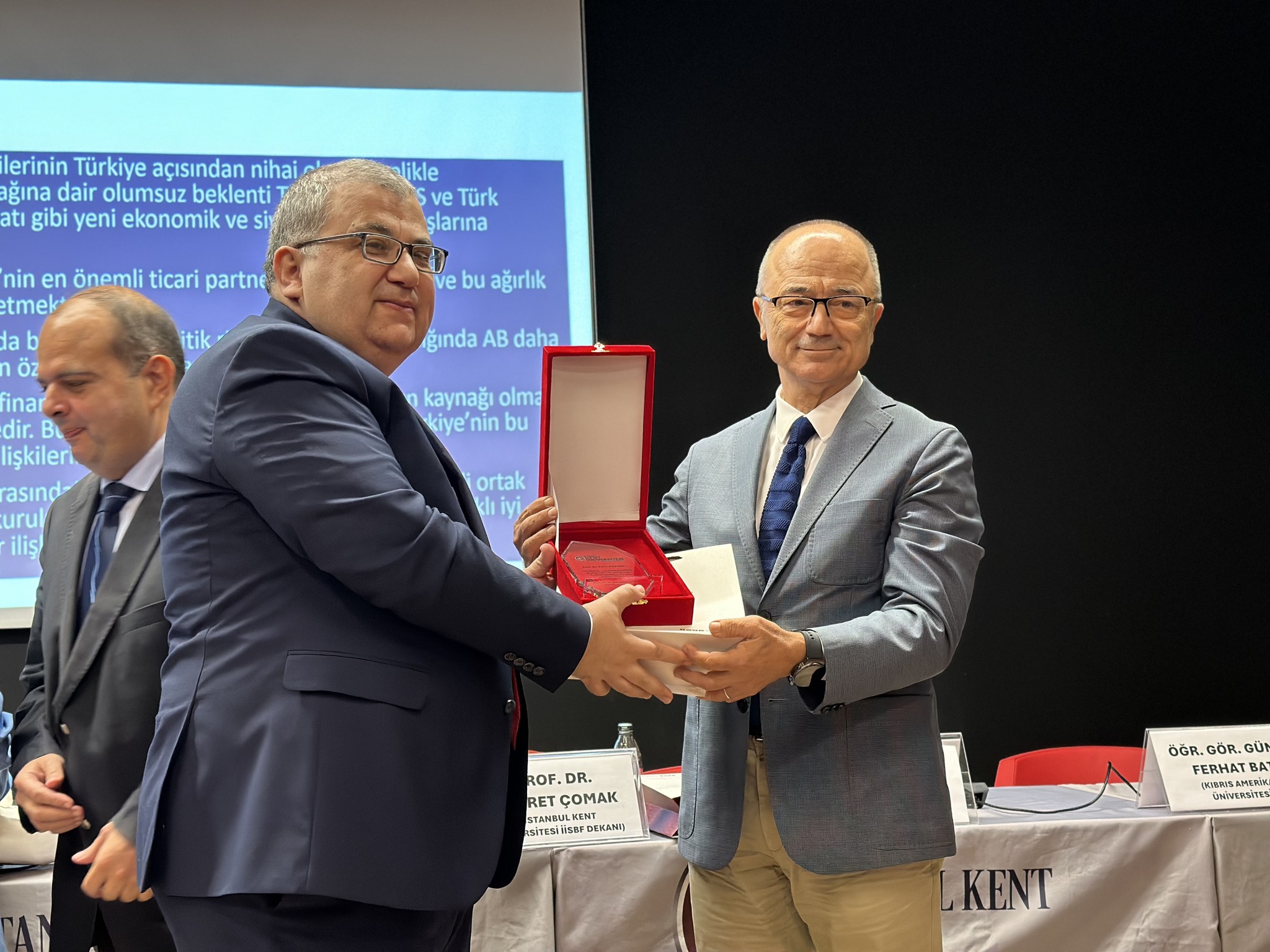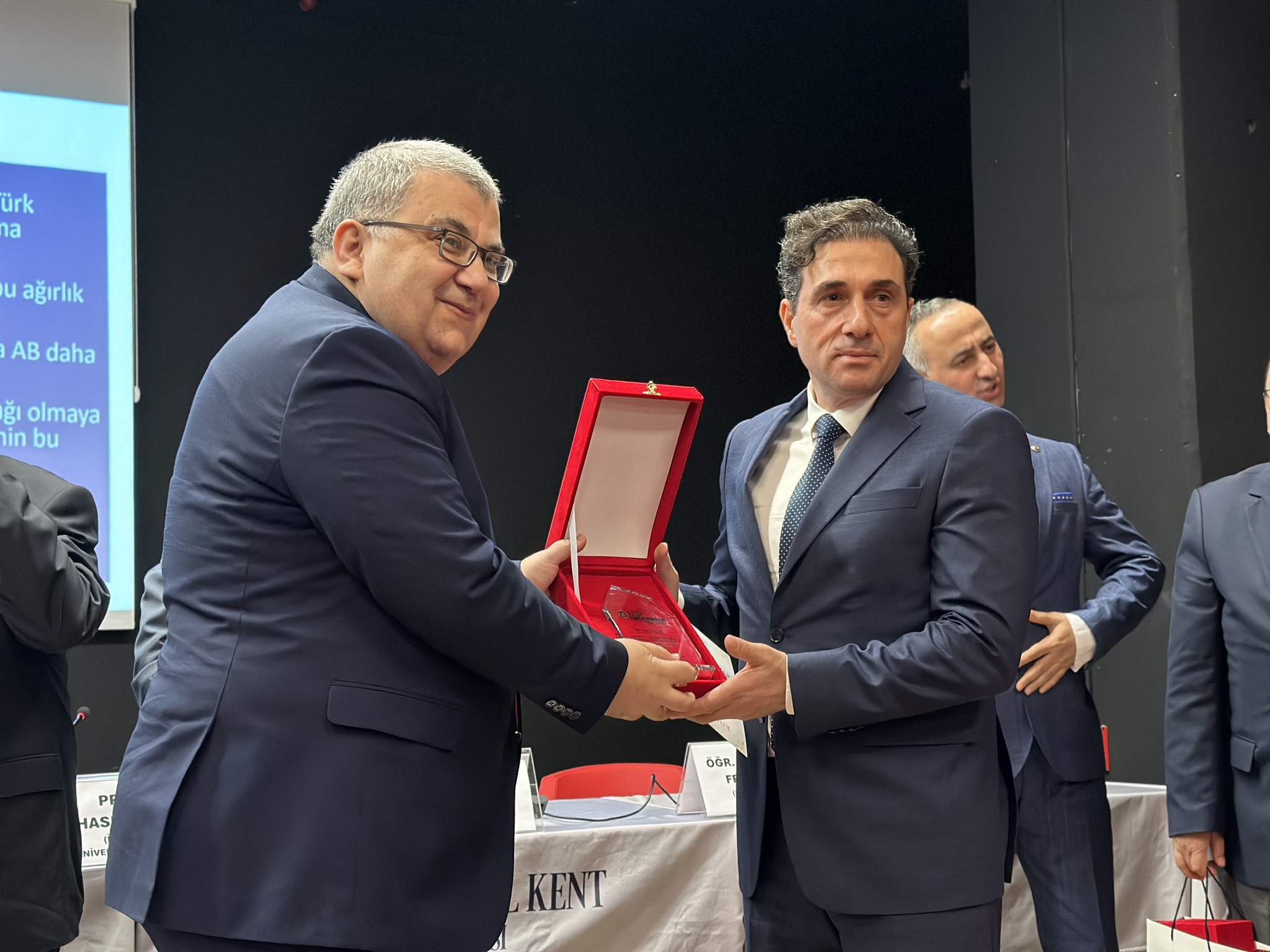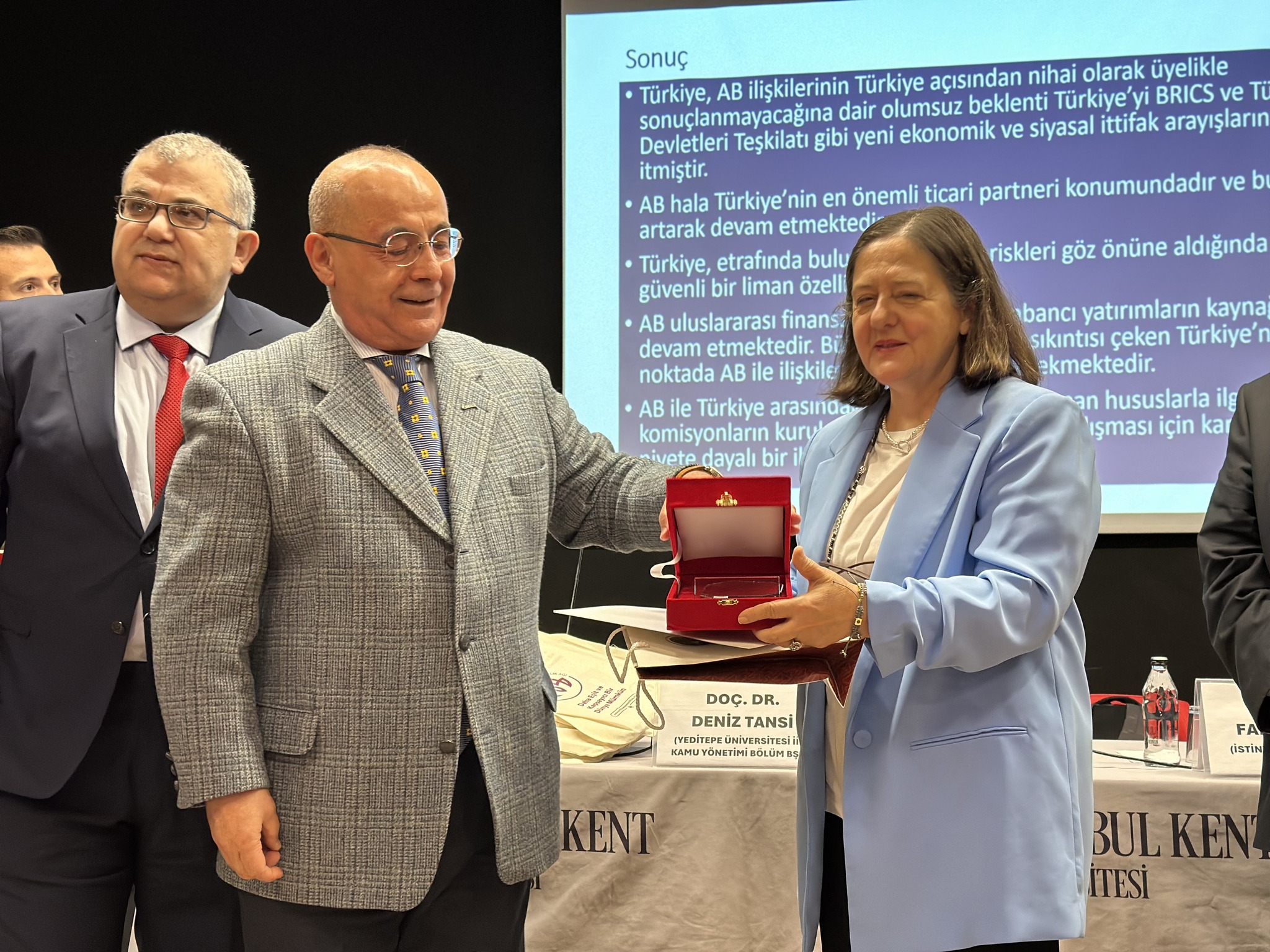 Konferansın Sonunda Konuşmacılara “Plaket” ve “Teşekkür Sertifikası” verildi. Prof. Dr. Fahri Erenel, Doç. Dr. Deniz Tansi, Doç. Dr. Çiğdem Nas, Doktorant Ayşe Kaşıkırık, Öğretim Görevlisi Güney Ferhat Batı, Dr. Ayhan Koç ve Hnr. Dr. Musa Karademir.